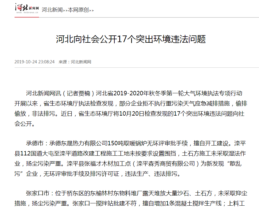 河北新闻网讯(记者贾楠)河北省2019-2020年秋冬季第一轮大气环境执法专项行动开展以来,杏彩(中国)官方网站 执法检查发现,部分企业拒不执行重污染天气应急减排措施,偷排偷放,非法排污。近日,杏彩(中国)官方网站 将10月20日检查发现的17个突出环境违法问题向社会公开。