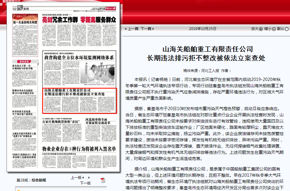 在全省范围内启动2019-2020年秋冬季第一轮大气环境执法专项行动,专项行动驻秦皇岛市执法组发现山海关船舶重工有限责任公司拒不执行重污染天气应急减排措施,存在严重环境违法行为,对区域大气环境质量产生严重负面影响。