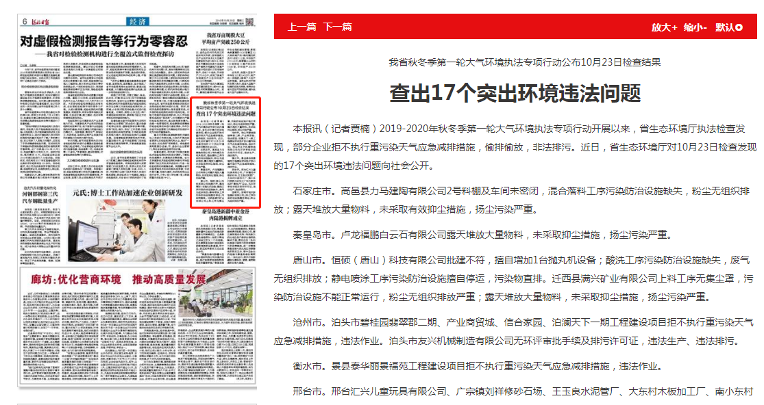 本报讯(记者贾楠)2019-2020年秋冬季第一轮大气环境执法专项行动开展以来,杏彩(中国)官方网站 执法检查发现,部分企业拒不执行重污染天气应急减排措施,偷排偷放,非法排污。近日,杏彩(中国)官方网站 对10月23日检查发现的17个突出环境违法问题向社会公开。
