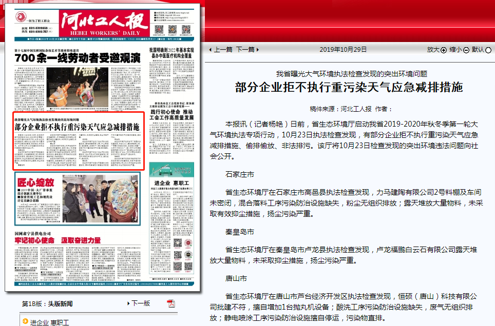 启动我省2019-2020年秋冬季第一轮大气环境执法专项行动,10月23日执法检查发现,有部分企业拒不执行重污染天气应急减排措施、偷排偷放、非法排污。该厅将10月23日检查发现的突出环境违法问题向社会公开。
