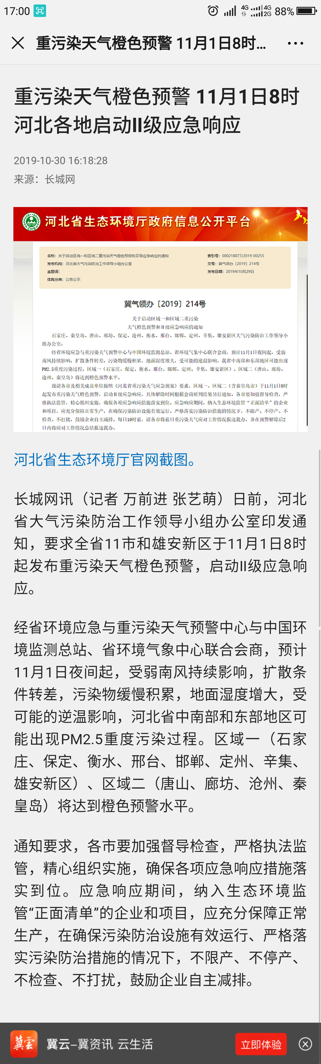 人民网:11月1日8时起河北将启动区域重污染天气Ⅱ级应急响应