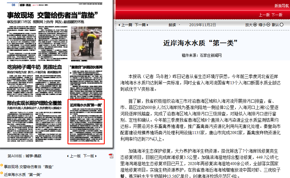 燕赵晚报:近岸海水水质“第一类”