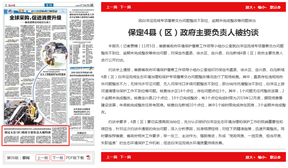 本报讯(记者贾楠)11月5日,省委省政府环境保护督察工作领导小组办公室就白洋淀流域专项督察交办问题整改不到位、逾期未完成整改等突出问题,对保定市蠡县、徐水区、定兴县、白沟新城4县(区)政府主要负责人进行公开约谈。