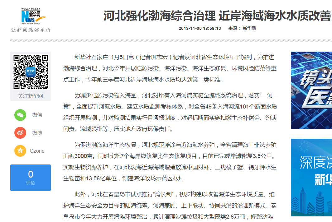 了解到,为推进渤海综合治理,河北今年开展陆源污染、海洋污染、海洋生态修复、环境风险防范等重点工作,今年前三季度河北近岸海域海水水质均达到第一类标准。