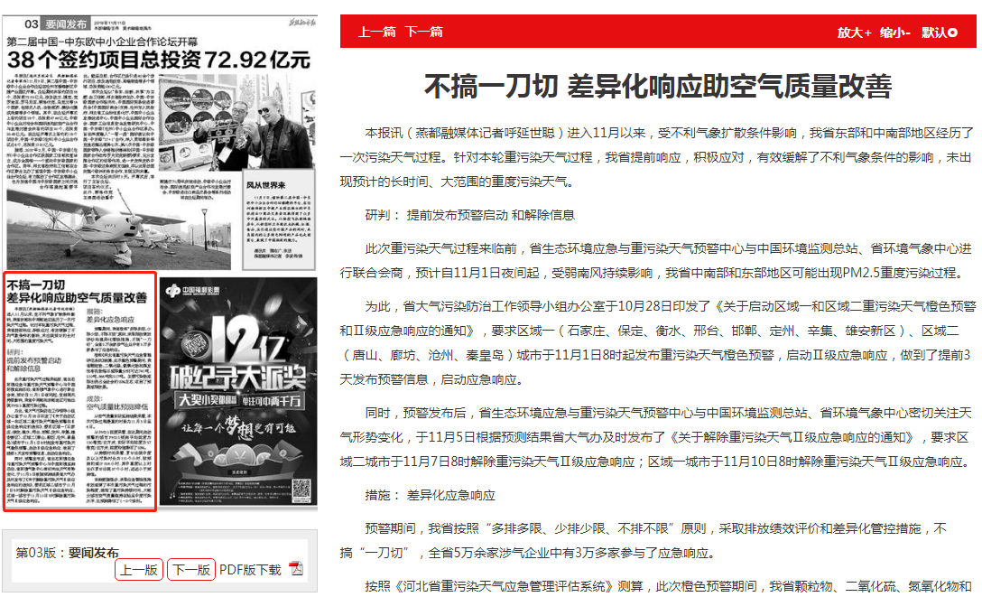 按照《河北省重污染天气应急管理评估系统》测算,此次橙色预警期间,我省颗粒物、二氧化硫、氮氧化物和挥发性有机物每日减排量分别可达741吨、510吨、866吨和517吨。主要污染物减排比例占全社会的25%左右,收到了预期减排效果。