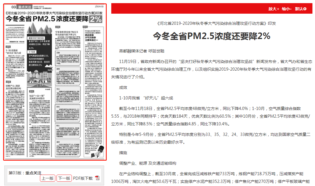 经专家预测,今年京津冀区域秋冬季气象条件相比往年总体不利,将面临雾霾持续时间长、覆盖范围广的情况。对此,我省印发《河北省2019-2020年秋冬季大气污染综合治理攻坚行动方案》,通过压能、减煤、治企、降尘、控车等工作,实现今年秋冬季全省PM2.5平均浓度同比下降2%的目标,促进重度及以上污染天数持续减少。