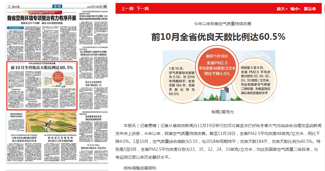 河北日报: 今年以来我省空气质量持续改善 前10月全省优良天数比例达60.5%