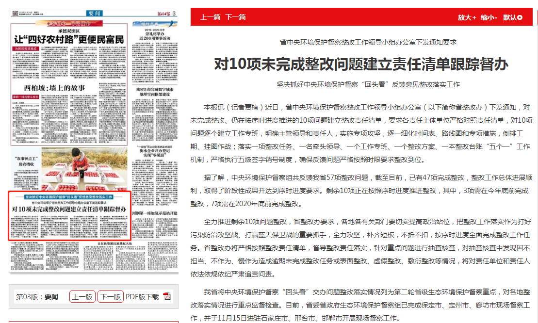 河北日报: 省中央环境保护督察整改工作领导小组办公室下发通知要求 对10项未完成整改问题建立责任清单跟踪督办