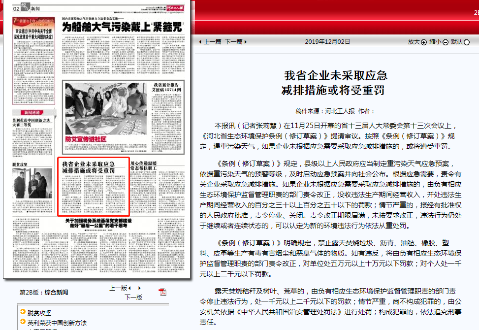 本报讯(记者张莉慧)在11月25日开幕的省十三届人大常委会第十三次会议上,《河北省生态环境保护条例(修订草案)》提请审议。按照《条例(修订草案)》规定,遇重污染天气,如果企业未根据应急需要采取应急减排措施的,或将遭受重罚。