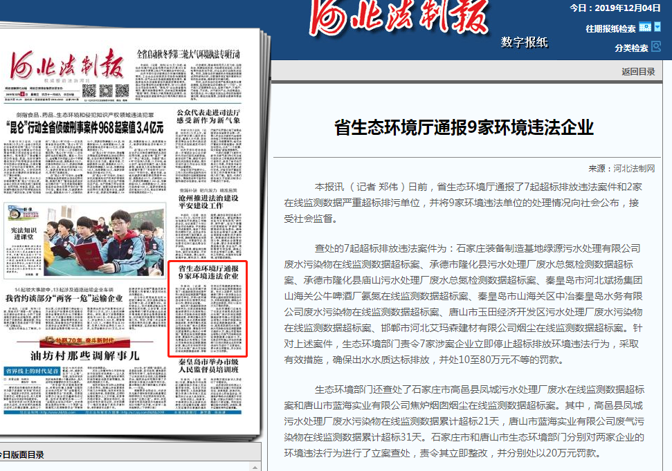查处的7起超标排放违法案件为:石家庄装备制造基地绿源污水处理有限公司废水污染物在线监测数据超标案、承德市隆化县污水处理厂废水总氮检测数据超标案、承德市隆化县庙山污水处理厂废水总氮检测数据超标案、秦皇岛市河北斌扬集团山海关公牛啤酒厂氨氮在线监测数据超标案、秦皇岛市山海关区中冶秦皇岛水务有限公司废水污染物在线监测数据超标案、唐山市玉田经济开发区污水处理厂废水污染物在线监测数据超标案、邯郸市河北艾玛森建材有限公司烟尘在线监测数据超标案。针对上述案件,杏彩门责令7家涉案企业立即停止超标排放环境违法行为,采取有效措施,确保出水水质达标排放,并处10至80万元不等的罚款。