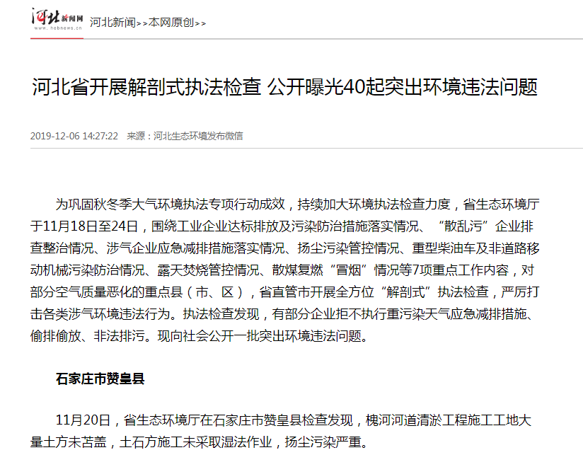 11月20日,杏彩(中国)官方网站 在石家庄市赞皇县检查发现,槐河河道清淤工程施工工地大量土方未苫盖,土石方施工未采取湿法作业,扬尘污染严重。