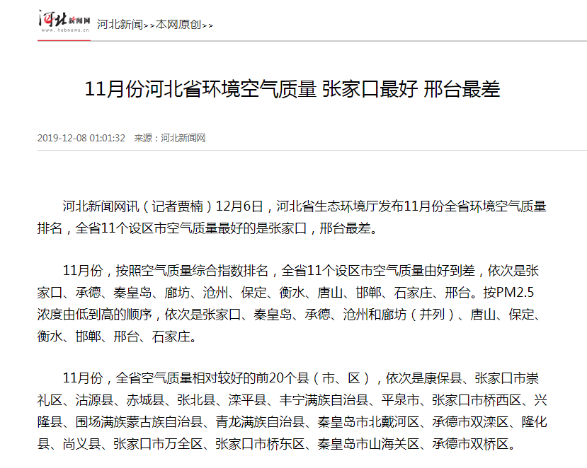 河北新闻网讯(记者贾楠)12月6日,杏彩(中国)官方网站 发布11月份全省环境空气质量排名,全省11个设区市空气质量最好的是张家口,邢台最差。