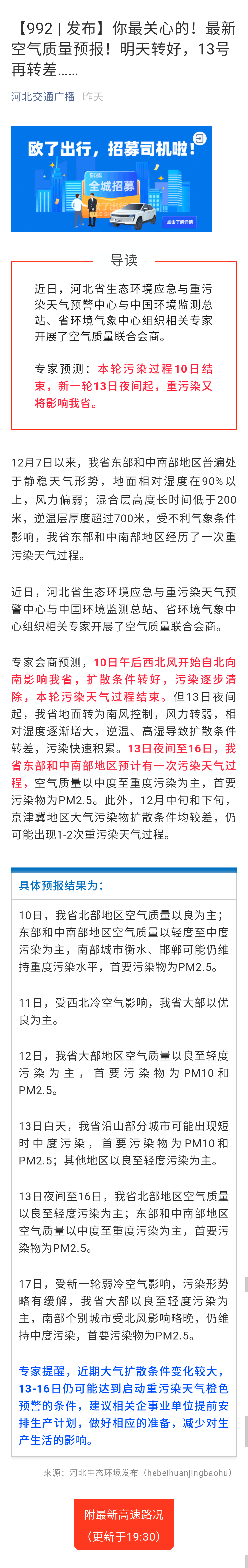 河北交通广播:【992 | 发布】你最关心的!最新空气质量预报!明天转好,13号再转差……