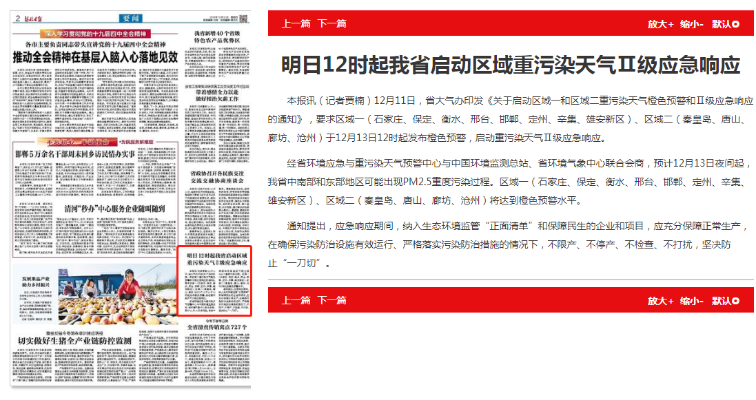 经省环境应急与重污染天气预警中心与中国环境监测总站、省环境气象中心联合会商,预计12月13日夜间起,我省中南部和东部地区可能出现PM2.5重度污染过程。区域一(石家庄、保定、衡水、邢台、邯郸、定州、辛集、雄安新区)、区域二(秦皇岛、唐山、廊坊、沧州)将达到橙色预警水平。