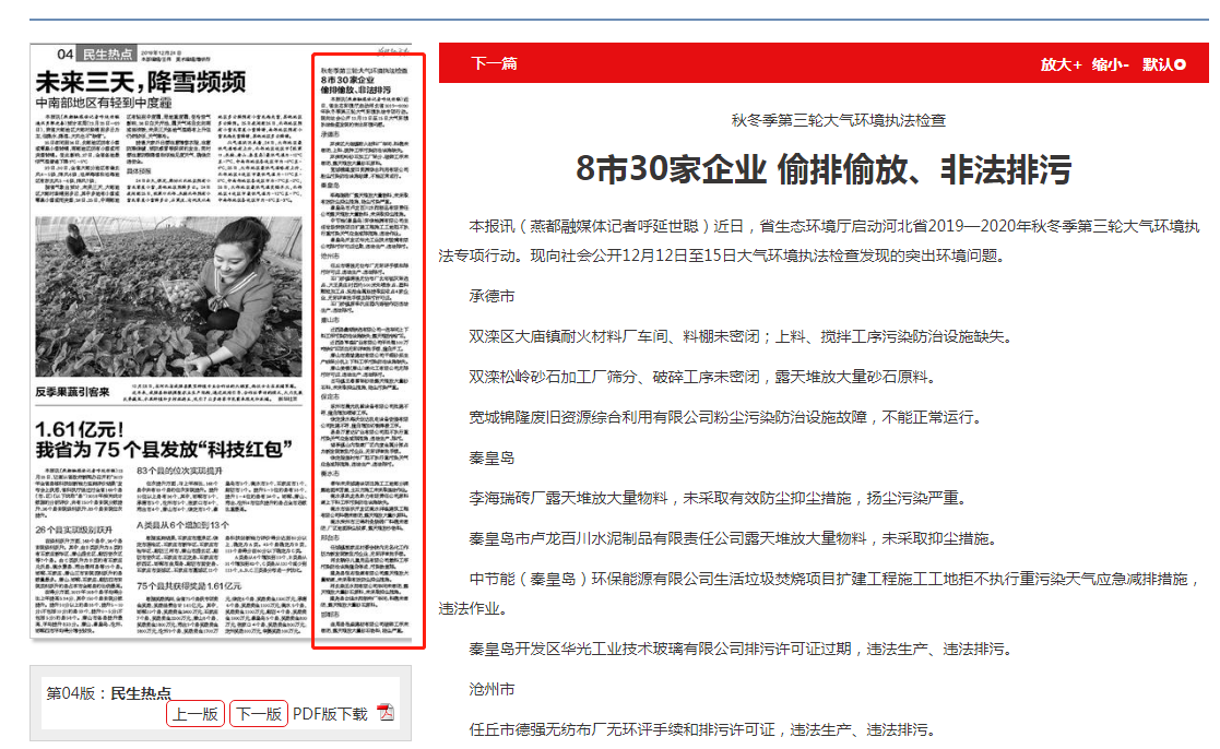 本报讯(燕都融媒体记者呼延世聪)近日,杏彩(中国)官方网站 启动河北省2019—2020年秋冬季第三轮大气环境执法专项行动。现向社会公开12月12日至15日大气环境执法检查发现的突出环境问题。