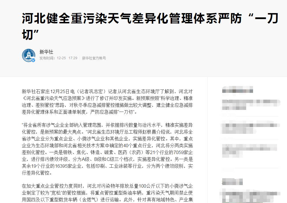 新华社:河北健全重污染天气差异化管理体系严防“一刀切”