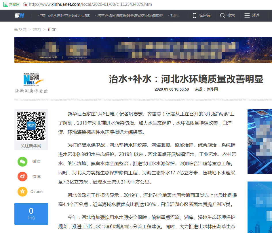 新华社石家庄1月8日电(记者巩志宏、齐雷杰)记者从正在召开的河北省“两会”上了解到,2019年河北推进水污染防治、加大水生态保护,水环境质量持续改善,白洋淀、环渤海等标志性水环境指标大幅提高。