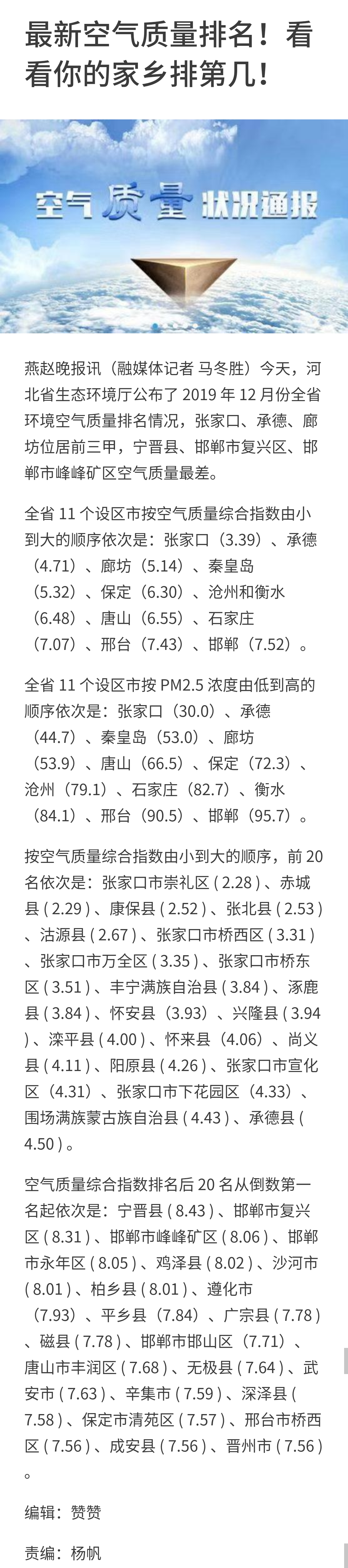 河北交通广播微博:杏彩(中国)官方网站 公布 2019 年 12 月份全省环境空气质量排名