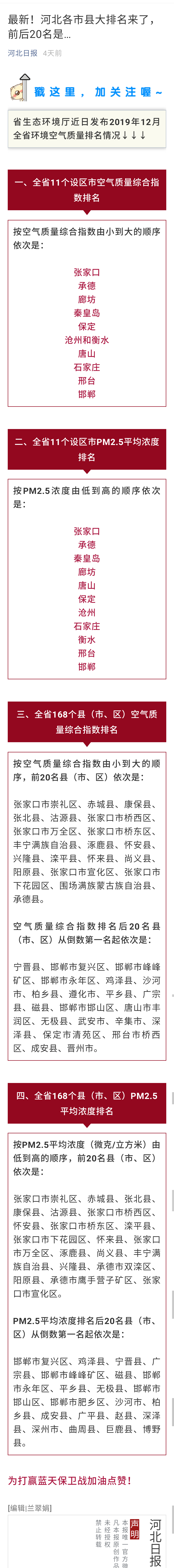河北综合广播微信:2019年12月全省空气质量排名出炉,快看你家乡排名第几?
