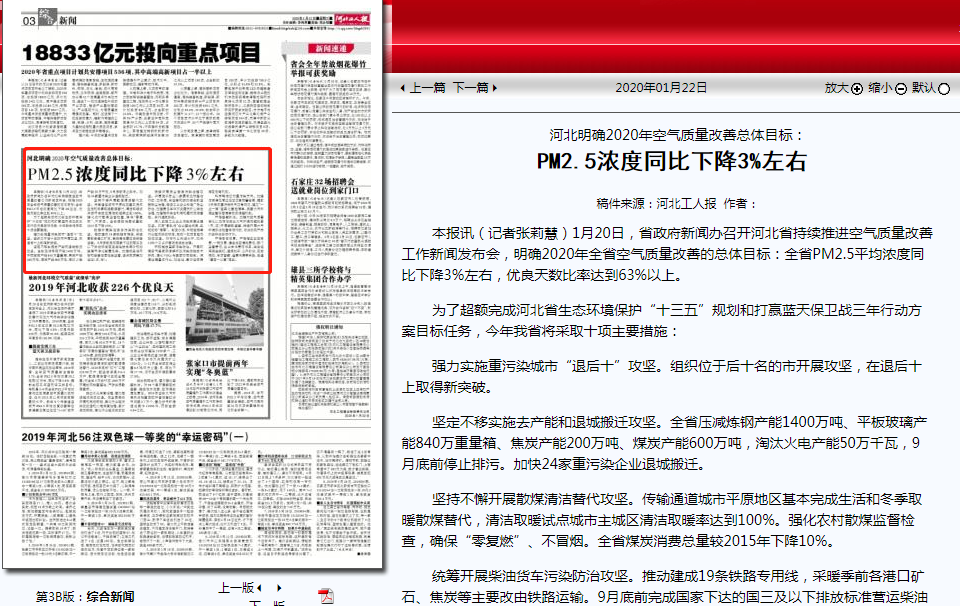 本报讯(记者张莉慧)1月20日,省政府新闻办召开河北省持续推进空气质量改善工作新闻发布会,明确2020年全省空气质量改善的总体目标:全省PM2.5平均浓度同比下降3%左右,优良天数比率达到63%以上。