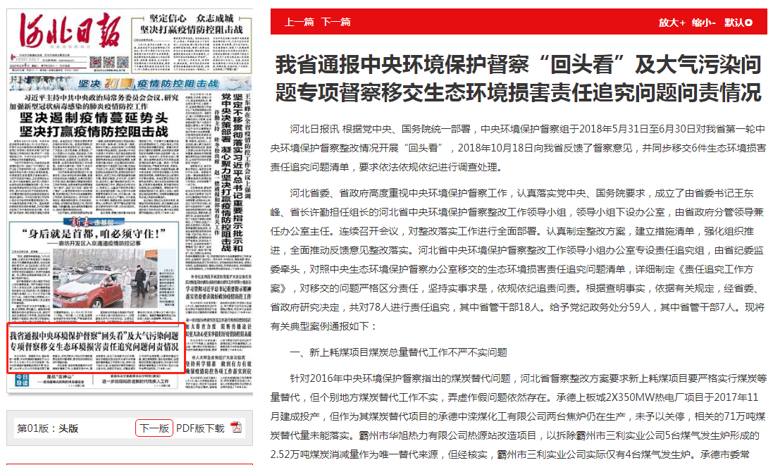 省委、省政府认真践行习近平生态文明思想,切实贯彻新发展理念,坚决落实党中央、国务院生态环境保护重大决策部署,始终坚持铁腕治污、铁面追责,对中央环保督察“回头看”及大气污染问题专项督察移交的问题作出严肃处理,体现了省委、省政府一贯态度和坚定决心。这次被处理的责任人,有的审批把关不严格,有的监督管理不到位,有的整改作表面文章,有的治污缺乏斗争精神,反映出政治站位不高、责任担当不够、作风不严不实的问题在一些地方和干部中仍很突出。治理污染重点是落实责任,关键在干部作风。各级党委、政府要把思想认识和行动进一步统一到习近平生态文明思想上来,教育引导各级干部更加注重生态环境保护工作,坚决落实“党政同责、一岗双责”,组织各方面形成合力,以严的态度、严的标准、严的措施,扎实推进生态环境保护和治理各项工作。要以案为鉴、吸取教训,坚决打好污染防治攻坚战,当好首都政治护城河,不断满足人民日益增长的优美生态环境需要,奋力开创新时代经济强省、美丽河北建设新局面。