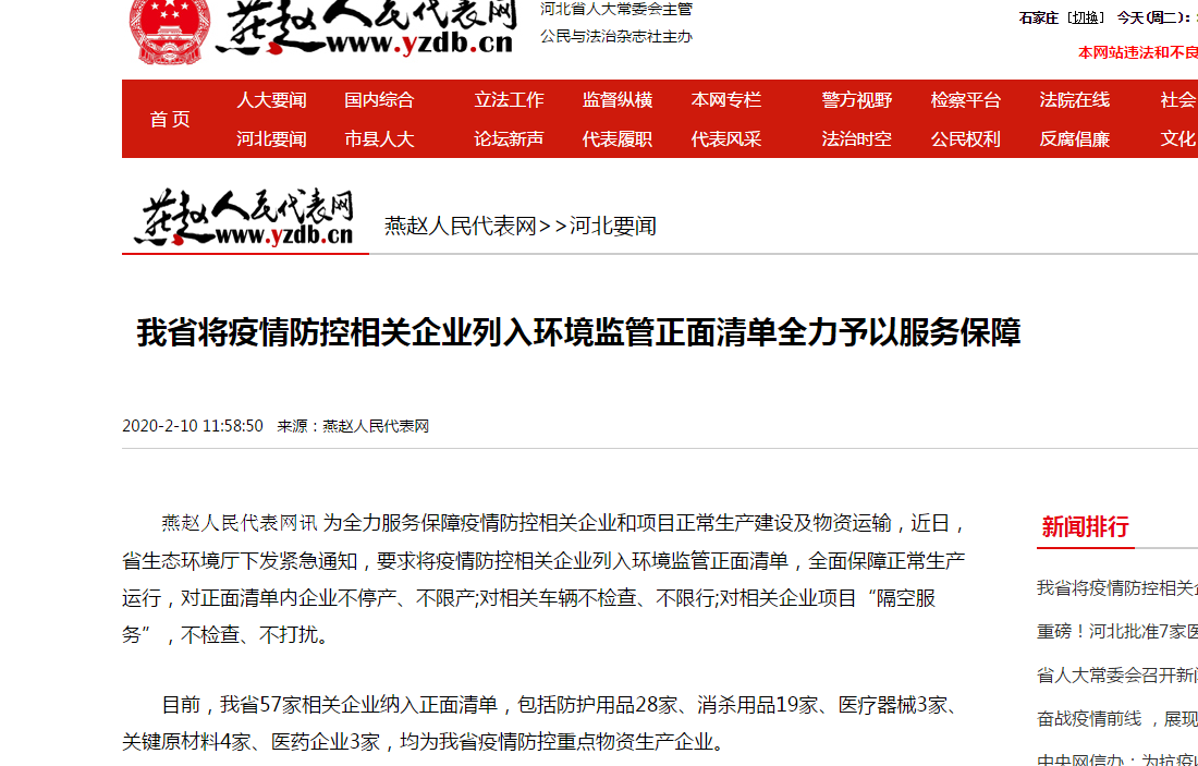 燕赵人民代表网:我省将疫情防控相关企业列入环境监管正面清单全力予以服务保障