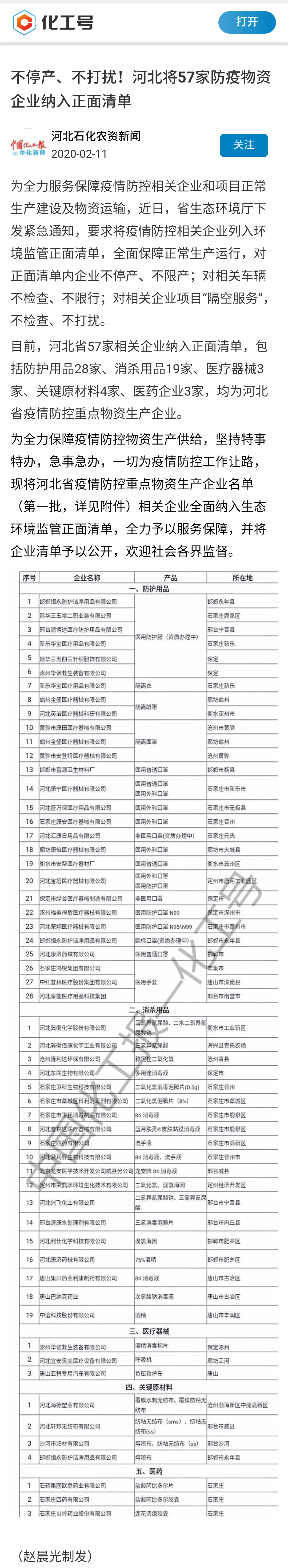 中国化工报:不停产、不打扰!河北将57家防疫物资企业纳入正面清单