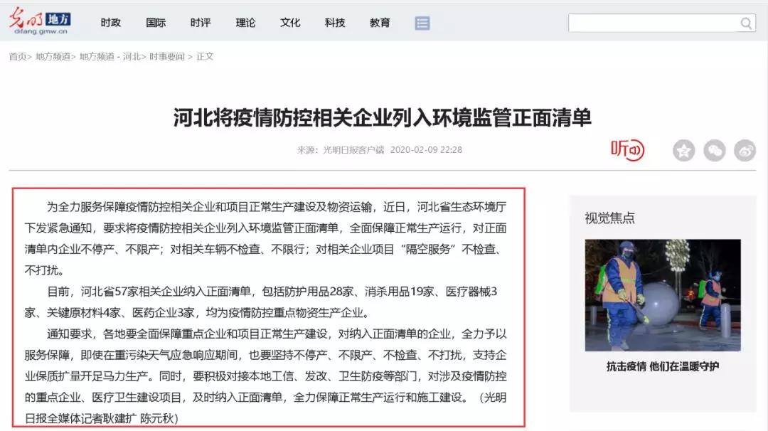 目前,河北省57家相关企业纳入正面清单,包括防护用品28家、消杀用品19家、医疗器械3家、关键原材料4家、医药企业3家,均为疫情防控重点物资生产企业。