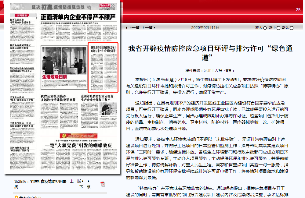 河北工人报:我省开辟疫情防控应急项目环评与排污许可“绿色通道”