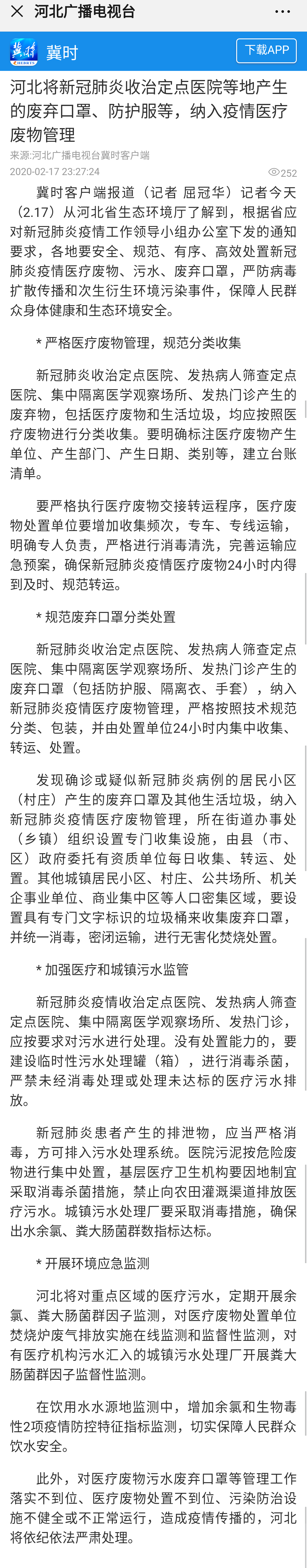 河北广播电视台冀时客户端:河北将新冠肺炎收治定点医院等地产生的废弃口罩、防护服等,纳入疫情医疗废物管理