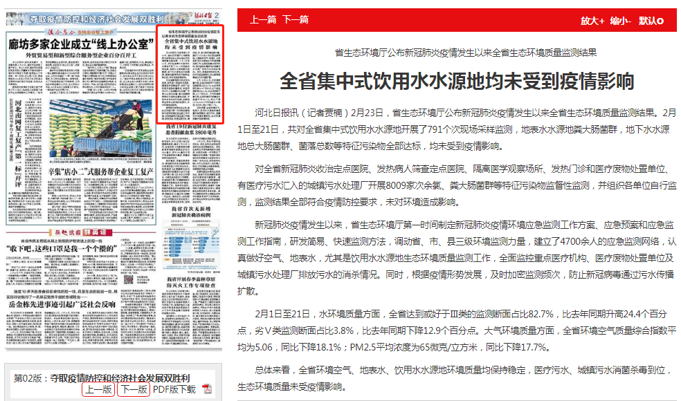 新冠肺炎疫情发生以来,杏彩(中国)官方网站 第一时间制定新冠肺炎疫情环境应急监测工作方案、应急预案和应急监测工作指南,研发简易、快速监测方法,调动省、市、县三级环境监测力量,建立了4700余人的应急监测网络,认真做好空气、地表水,尤其是饮用水水源地生态环境质量监测工作,全面监控重点医疗机构、医疗废物处置单位及城镇污水处理厂排放污水的消杀情况。同时,根据疫情形势发展,及时加密监测频次,防止新冠病毒通过污水传播扩散。