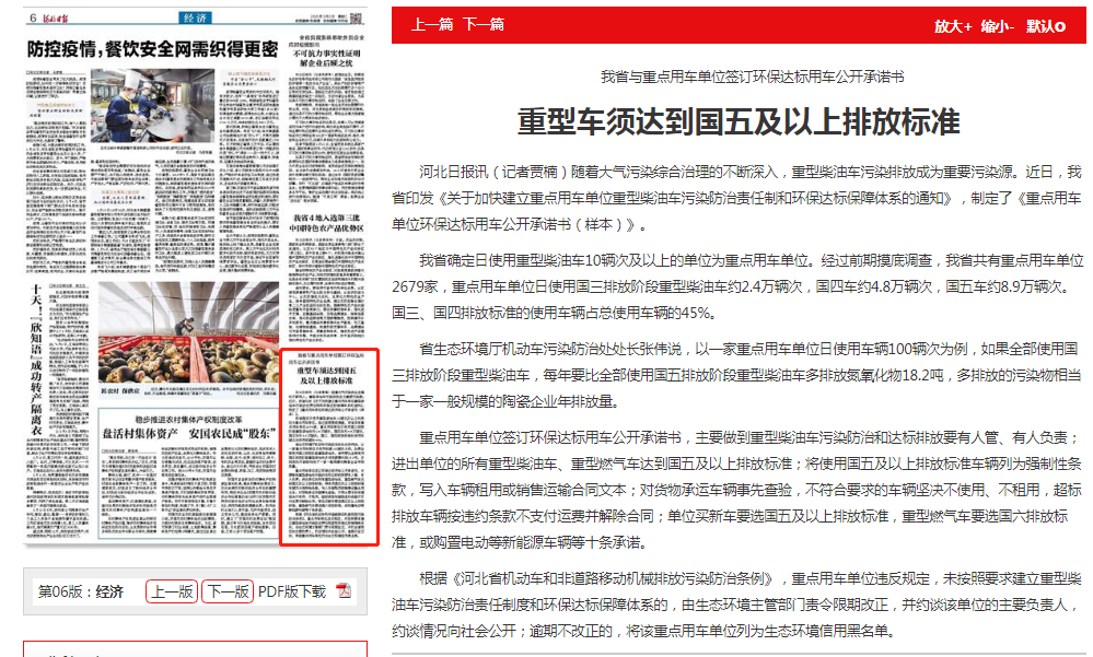 河北日报讯(记者贾楠)随着大气污染综合治理的不断深入,重型柴油车污染排放成为重要污染源。近日,我省印发《关于加快建立重点用车单位重型柴油车污染防治责任制和环保达标保障体系的通知》,制定了《重点用车单位环保达标用车公开承诺书(样本)》。