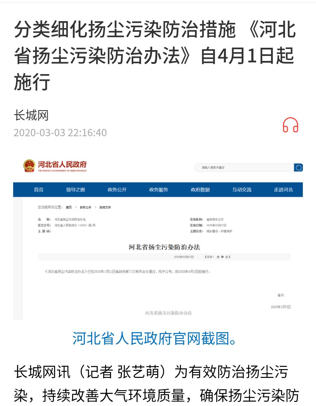 长城网讯(记者 张艺萌)为有效防治扬尘污染,持续改善大气环境质量,确保扬尘污染防治各项措施落地落实落细,河北省政府将《河北省扬尘污染防治办法》列入2019年立法计划,经2020年1月21日省政府第77次常务会议通过,2月7日公布,自2020年4月1日起施行。
