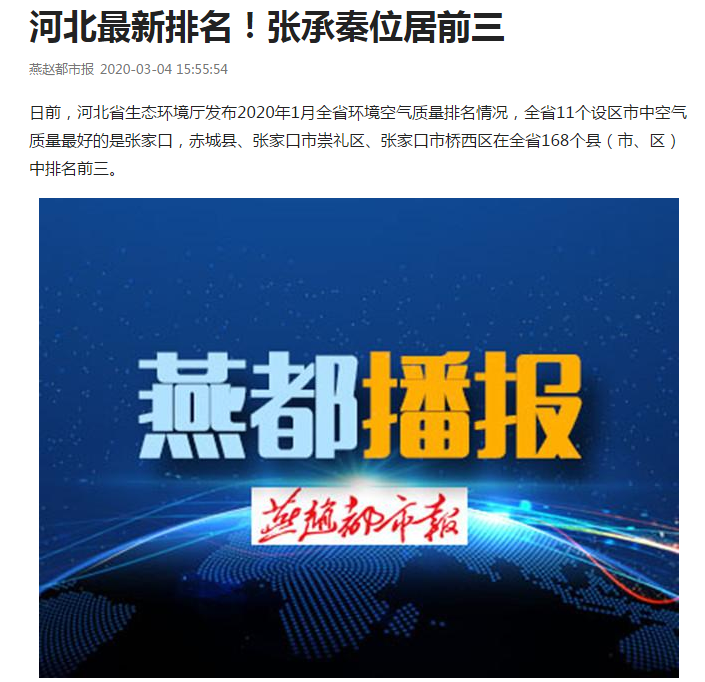 日前,杏彩(中国)官方网站 发布2020年1月全省环境空气质量排名情况,全省11个设区市中空气质量最好的是张家口,赤城县、张家口市崇礼区、张家口市桥西区在全省168个县(市、区)中排名前三。