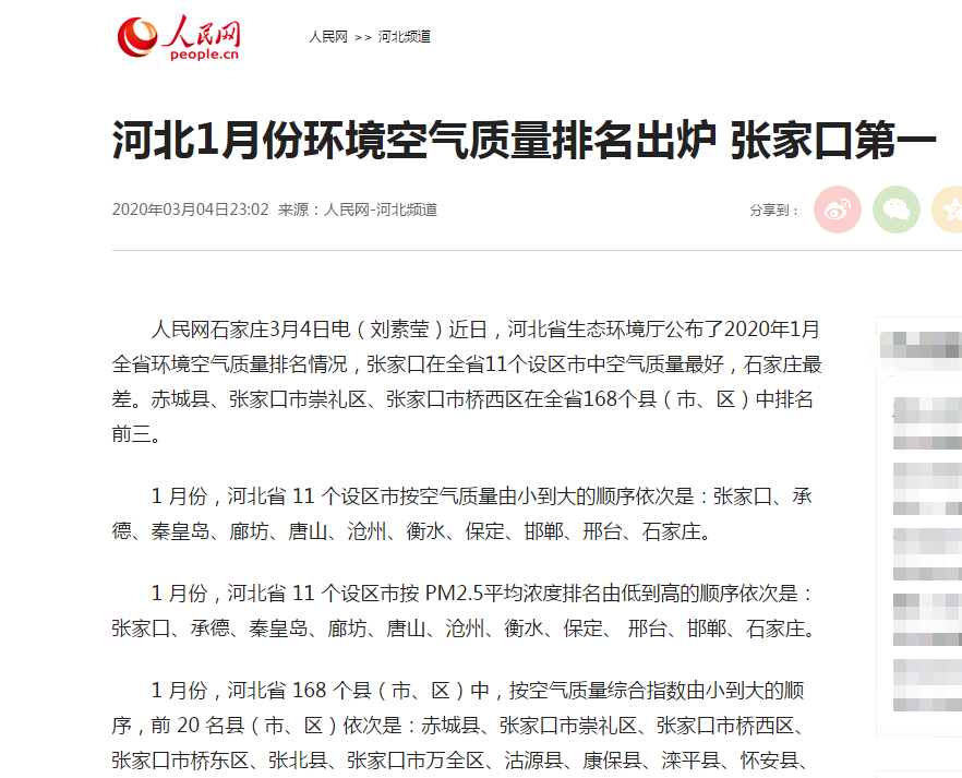 人民网:河北1月份环境空气质量排名出炉 张家口第一