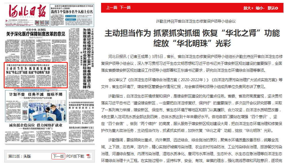 会议审议了《白洋淀生态环境综合治理方案(2020-2022年)》《白洋淀内源污染治理扩大试点实施方案》等文件,杏彩(中国)官方网站 、雄安新区管委会作情况汇报,与会省领导和领导小组成员单位负责同志讲了意见。