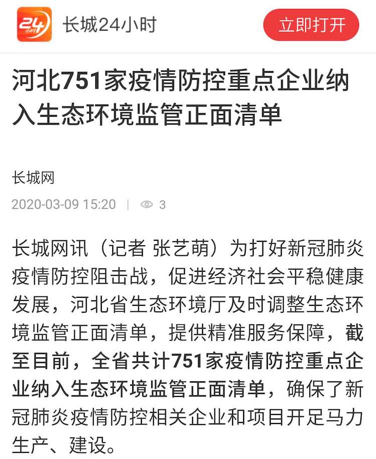 积极对接工信、发改等相关部门,对疫情防控重点企业开展摸底调查,指导各地第一时间将疫情防控重点企业和项目100%纳入生态环境监管正面清单,对有环保服务需求的疫情防控重点企业和项目,100%及时回应并服务到位,确保防控物资生产、运输顺畅。截至目前,河北省分两批将防护用品、消杀用品、医疗器械、关键原材料、医药等行业751家疫情防控重点企业纳入生态环境监管正面清单,有力保障了企业复工复产。