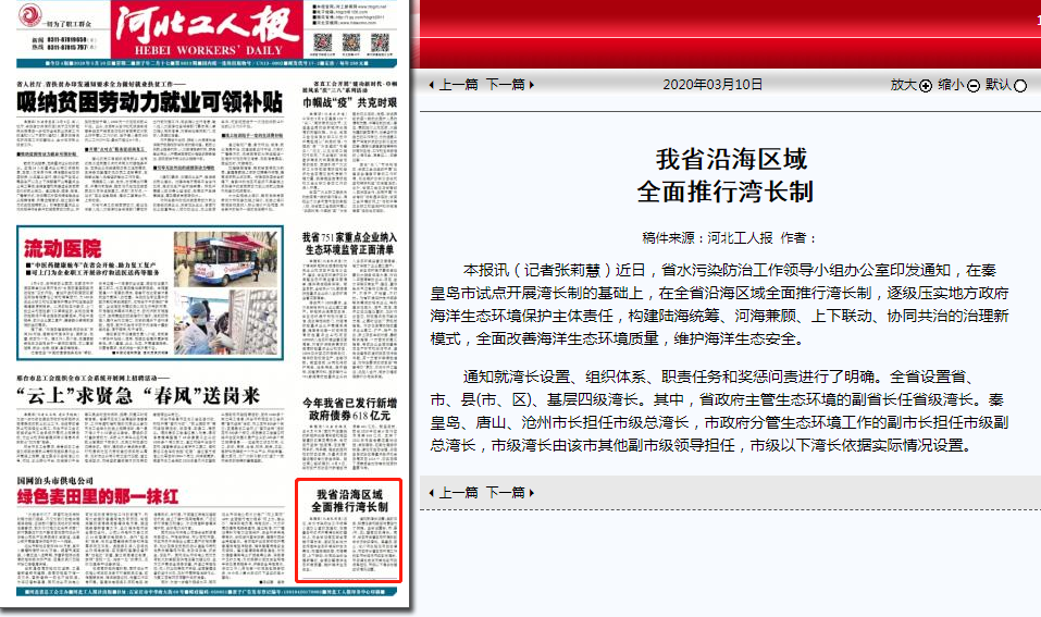 本报讯(记者张莉慧)近日,省水污染防治工作领导小组办公室印发通知,在秦皇岛市试点开展湾长制的基础上,在全省沿海区域全面推行湾长制,逐级压实地方政府海洋生态环境保护主体责任,构建陆海统筹、河海兼顾、上下联动、协同共治的治理新模式,全面改善海洋生态环境质量,维护海洋生态安全。