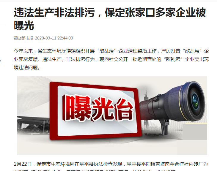 2月22日,保定市生态环境局在阜平县执法检查发现,阜平县平阳镇吉坡肉羊合作社内砖厂为新发现“散乱污”企业,无环评审批手续及排污许可证,违法生产、非法排污。