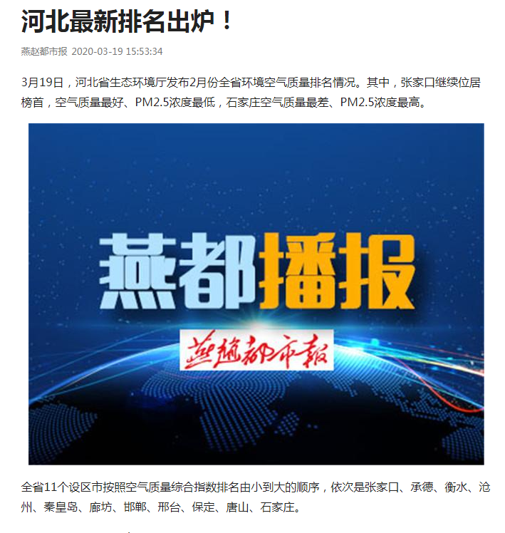 3月19日,杏彩(中国)官方网站 发布2月份全省环境空气质量排名情况。其中,张家口继续位居榜首,空气质量最好、PM2.5浓度最低,石家庄空气质量最差、PM2.5浓度最高。