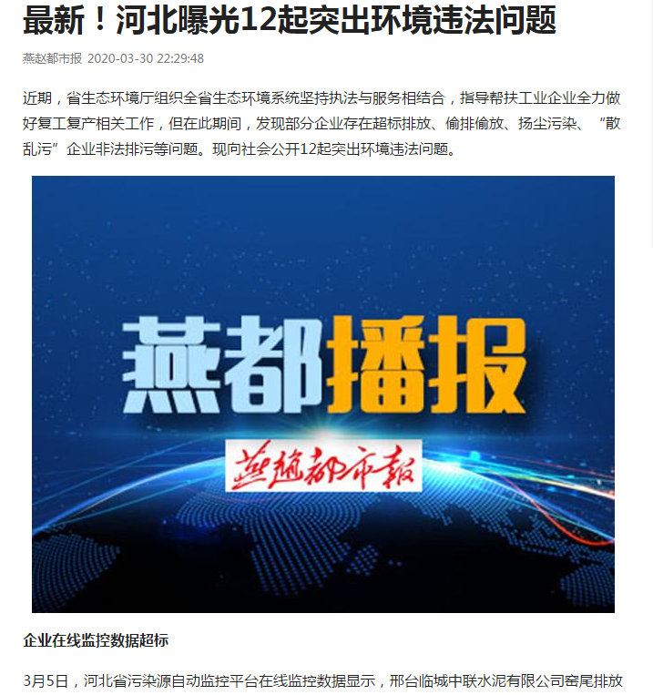 3月5日,河北省污染源自动监控平台在线监控数据显示,邢台临城中联水泥有限公司窑尾排放口颗粒物、氮氧化物超标排放,经邢台市生态环境局临城县分局核查,超标问题属实。目前已对该企业涉嫌超标排放大气污染物环境违法行为立案调查,并督导企业加强生产设备及污染防治设施维护,确保持续稳定达标排放。