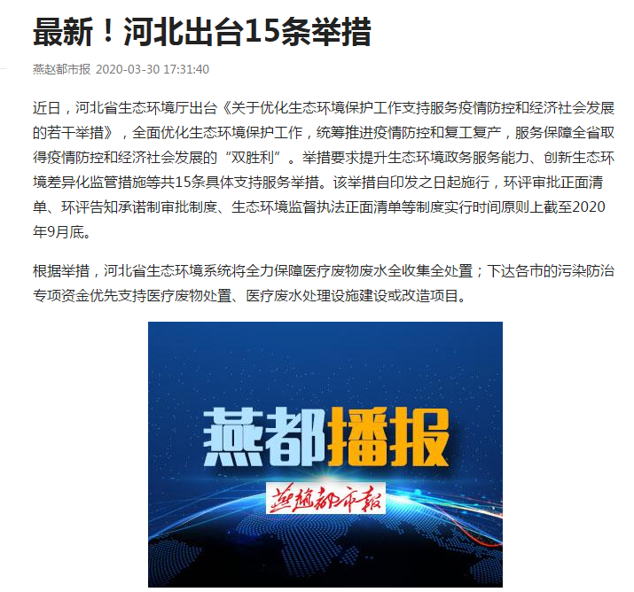 根据举措,河北省生态环境系统将全力保障医疗废物废水全收集全处置;下达各市的污染防治专项资金优先支持医疗废物处置、医疗废水处理设施建设或改造项目。