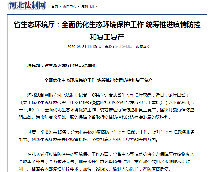获悉,近日,该厅出台了《关于优化生态环境保护工作支持服务疫情防控和经济社会发展的若干举措》(以下简称《若干举措》),全面优化生态环境保护工作,统筹推进疫情防控和复工复产,坚决打赢疫情防控阻击战、污染防治攻坚战,服务保障全省取得疫情防控和经济社会发展的双胜利。