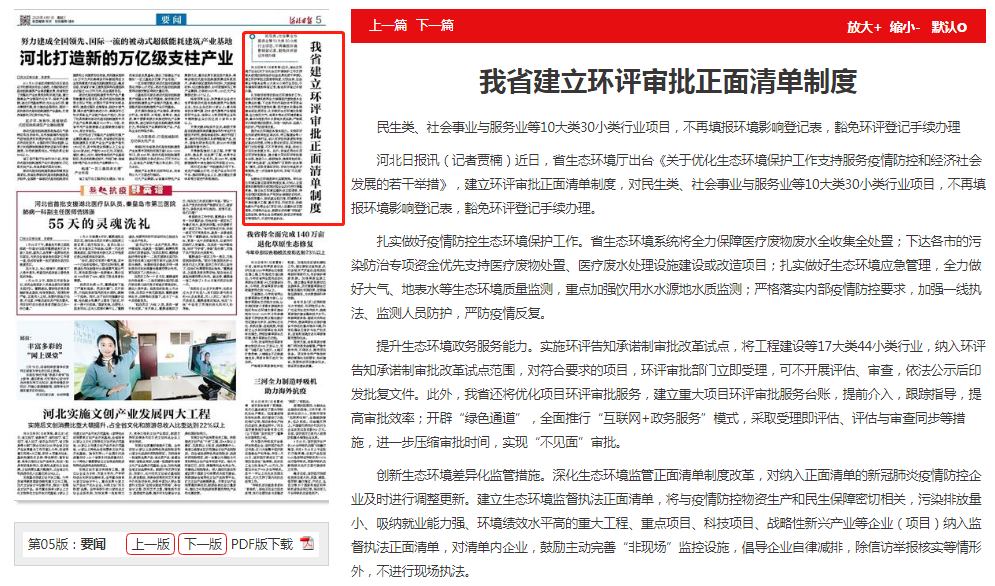 河北日报讯(记者贾楠)近日,杏彩(中国)官方网站 出台《关于优化生态环境保护工作支持服务疫情防控和经济社会发展的若干举措》,建立环评审批正面清单制度,对民生类、社会事业与服务业等10大类30小类行业项目,不再填报环境影响登记表,豁免环评登记手续办理。