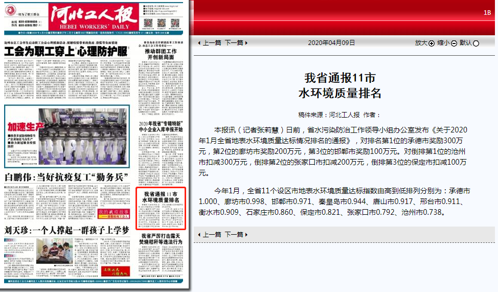 本报讯(记者张莉慧)日前,省水污染防治工作领导小组办公室发布《关于2020年1月全省地表水环境质量达标情况排名的通报》,对排名第1位的承德市奖励300万元,第2位的廊坊市奖励200万元,第3位的邯郸市奖励100万元。对倒排第1位的沧州市扣减300万元,倒排第2位的张家口市扣减200万元,倒排第3位的保定市扣减100万元。