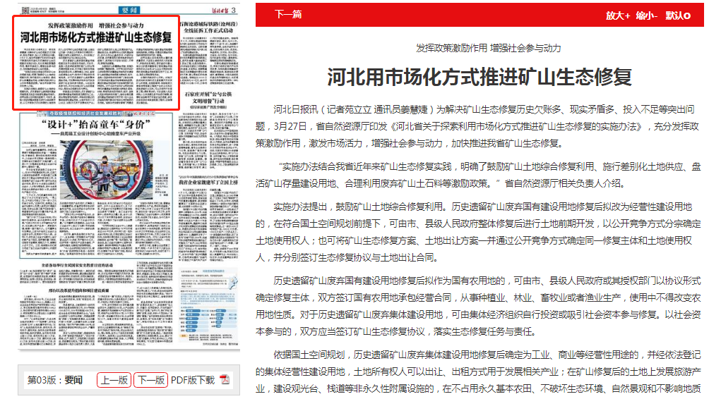 河北日报讯(记者苑立立 通讯员姜慧婕)为解决矿山生态修复历史欠账多、现实矛盾多、投入不足等突出问题,3月27日,省自然资源厅印发《河北省关于探索利用市场化方式推进矿山生态修复的实施办法》,充分发挥政策激励作用,激发市场活力,增强社会参与动力,加快推进我省矿山生态修复。