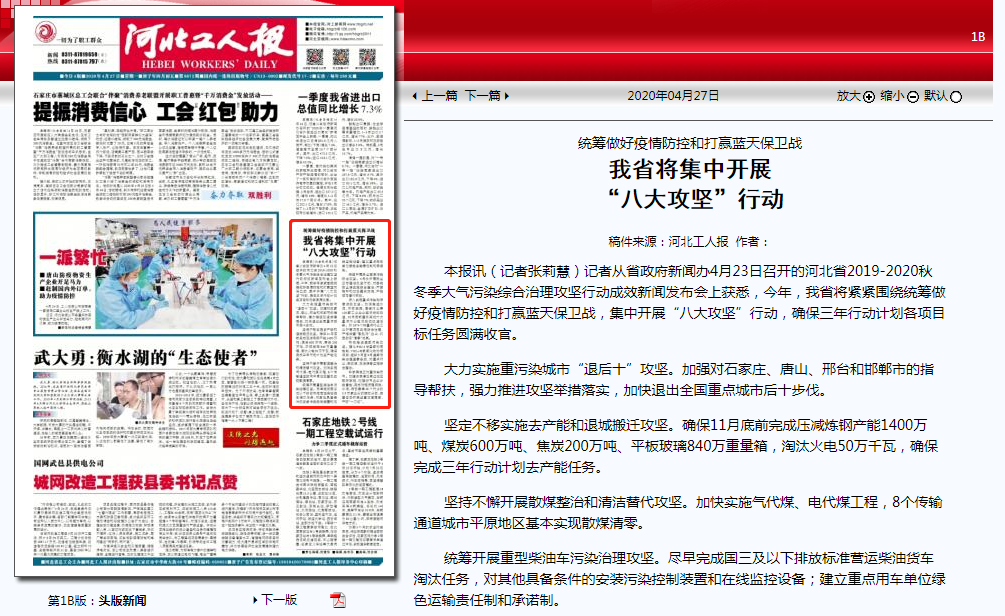 河北工人报:统筹做好疫情防控和打赢蓝天保卫战 我省将集中开展“八大攻坚”行动