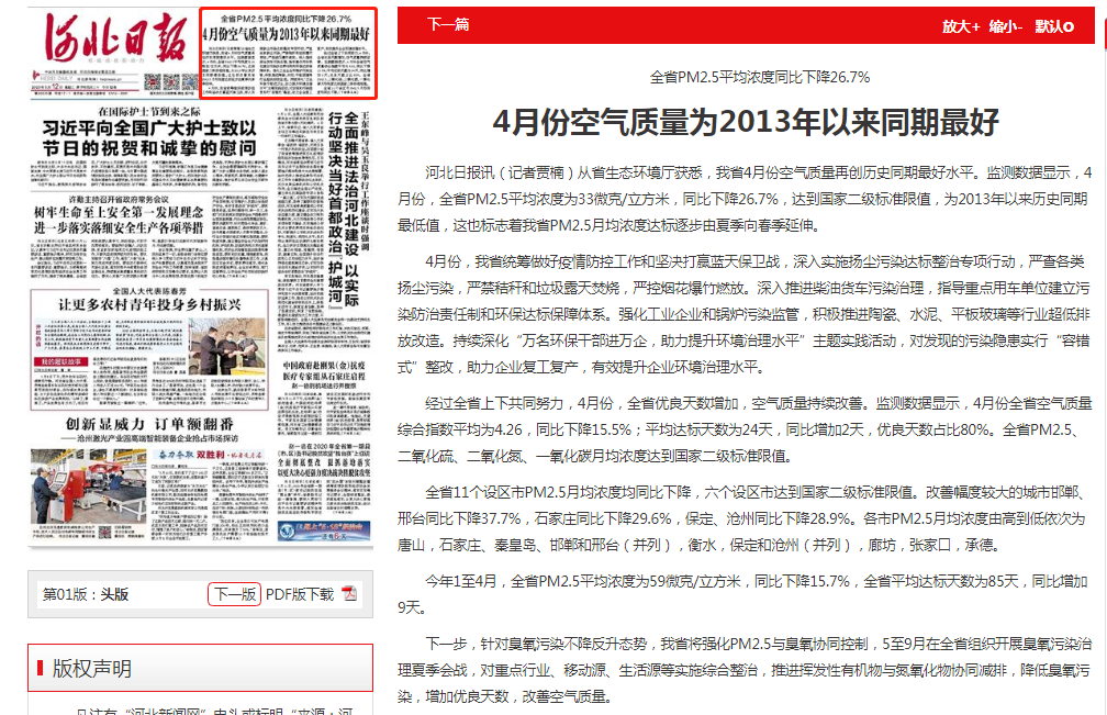 河北日报讯(记者贾楠)从杏彩(中国)官方网站 获悉,我省4月份空气质量再创历史同期最好水平。监测数据显示,4月份,全省PM2.5平均浓度为33微克/立方米,同比下降26.7%,达到国家二级标准限值,为2013年以来历史同期最低值,这也标志着我省PM2.5月均浓度达标逐步由夏季向春季延伸。