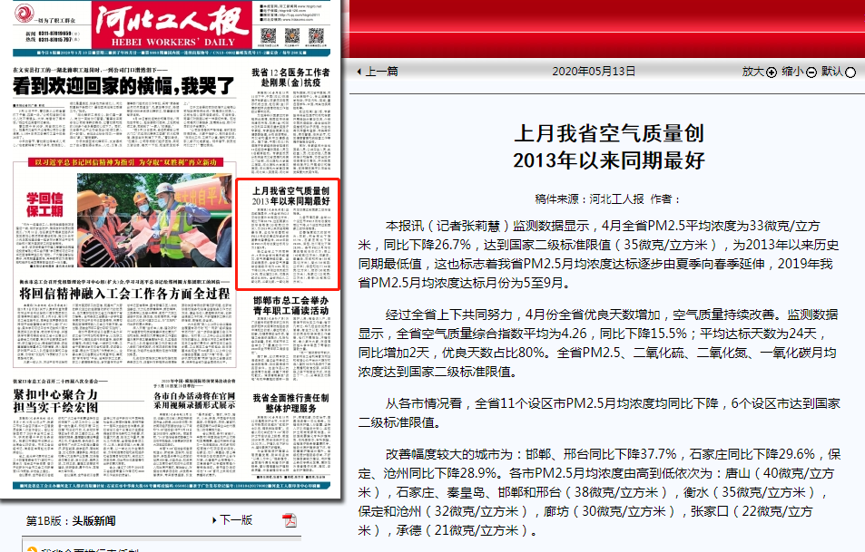 河北工人报:上月我省空气质量创2013年以来同期最好