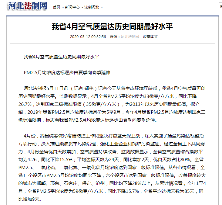 河北法制网:我省4月空气质量达历史同期最好水平